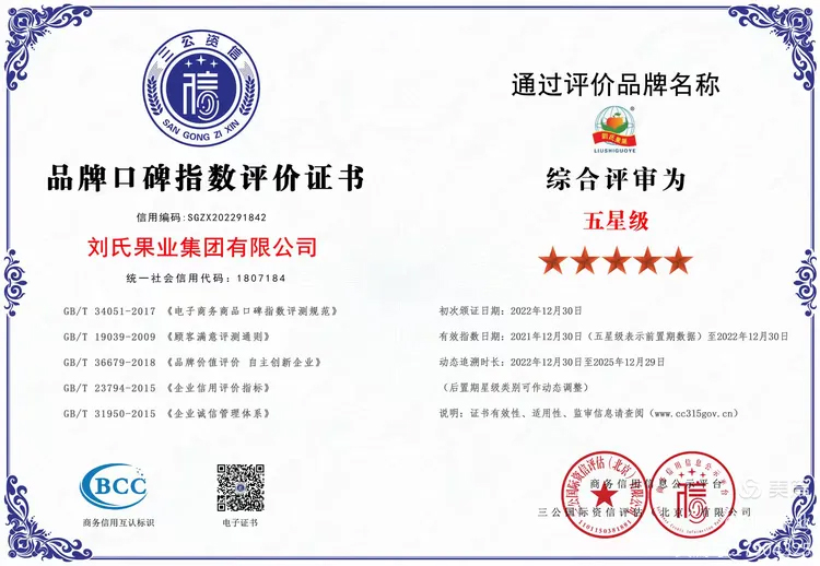 品牌口碑指数评价证书